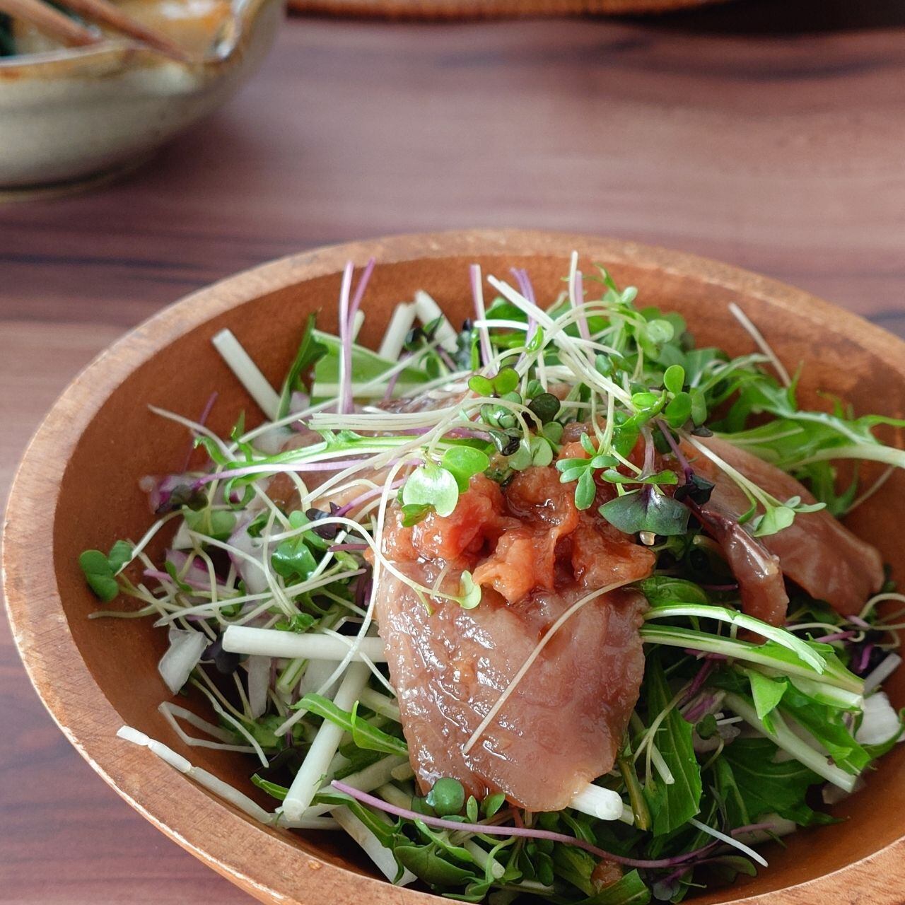 梅あえ水菜サラダやおくら和えなどさっぱりと。